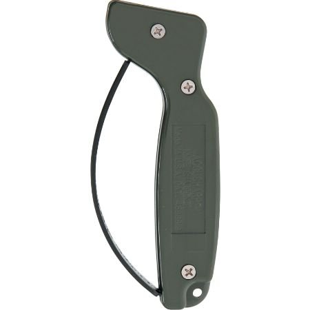 AccuSharp - Knife Sharpener with Multi Lingual Packaging & Green Handles. Model: AS8D. Uses no oils or stones. Tungsten carbide sharpener will not rust, and can be cleaned in dishwasher. Works on knives, axes, hoes and serrated edges. Full length safety guard protects fingers. Comes in multi-language packaging.